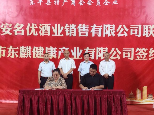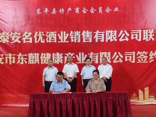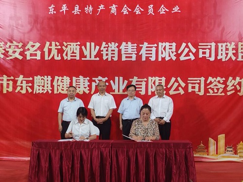7月31日上午,东平县工商联组织县特产商会会员企业泰安名优酒业销售有限公司联盟泰安市东麒健康产业有限公司举办签约仪式。