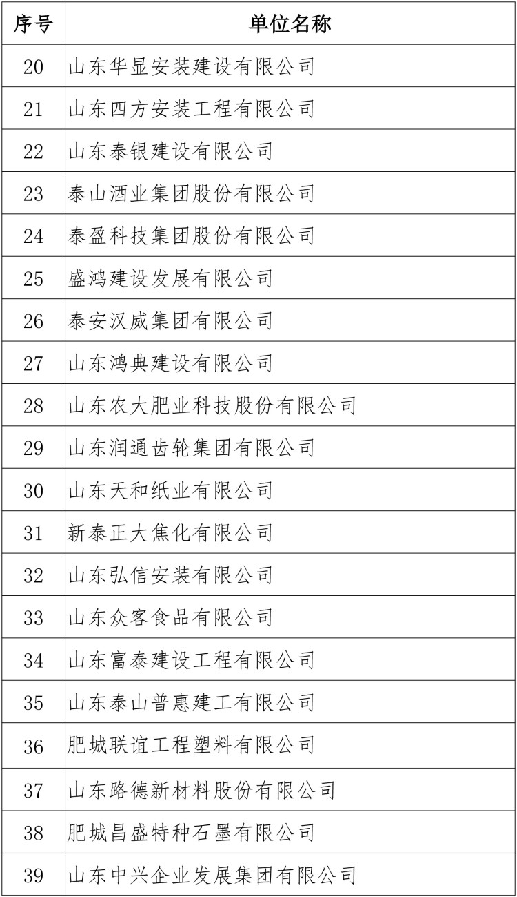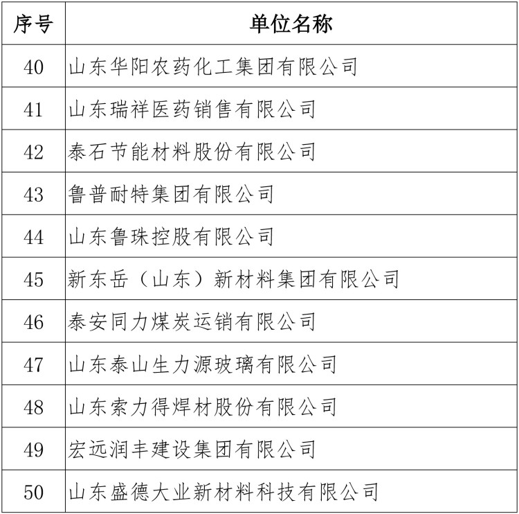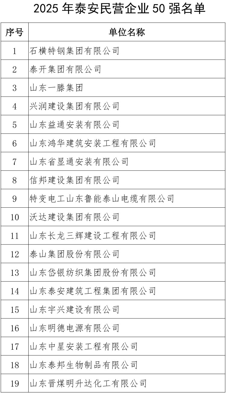 根据市工商业联合会、市发改委、市农业农村局、市商务局、市市场监督管理局、国家税务总局泰安市税务局联合印发的《关于开展2025年泰安民营企业50强申报活动的通知》要求,按规定程序完成了企业自愿申报,各县(市、区)工商联、市高新区审核推荐、活动工作组办公室初评、活动工作组成员单位共同审议等程序,拟确定石横特钢集团、泰开集团等50家企业为2025年泰安民营企业50强(按2024年度企业营收总额排序名单附后)。按照公开、公平、公正的原则,现将名单向社会公示,欢迎社会各界监督。