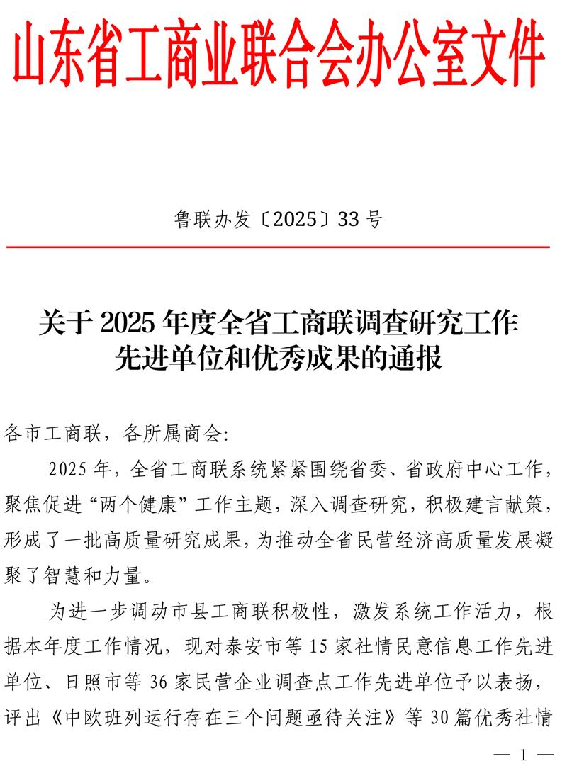 近日,山东省工商联印发《关于2025年度全省工商联调查研究工作先进单位和优秀成果的通报》,泰安市工商联成绩斐然,获得五项通报表扬。