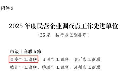 近日,山东省工商联印发《关于2025年度全省工商联调查研究工作先进单位和优秀成果的通报》,泰安市工商联成绩斐然,获得五项通报表扬。此次通报含社情民意信息工作先进单位、民营企业调查点工作先进单位、优秀社情民意信息、优秀提案及优秀调研成果五大类。泰安市工商联被评为“社情民意信息工作先进单位”和“民营企业调查点工作先进单位”。在优秀成果评选中,市工商联2篇稿件获评“2025年度优秀社情民意信息”,1篇获评“2025年度优秀提案”,1篇获评“2025年度优秀调研成果”。